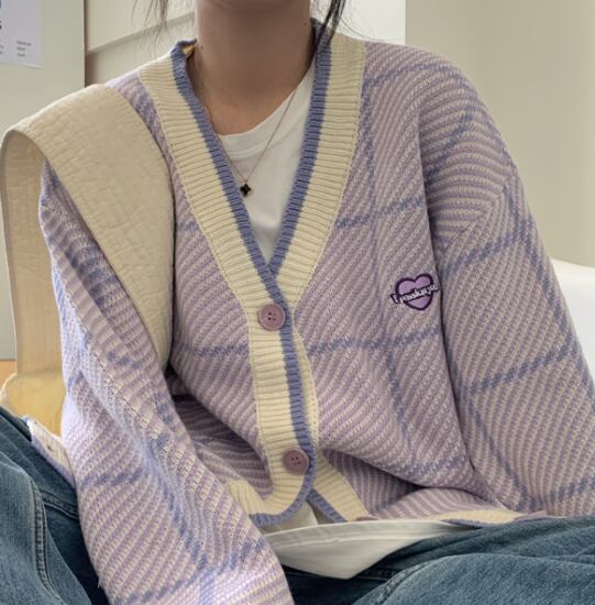 ニットカーディガン レディース カーディガン Vネック チェック柄 フロントボタン パープル 紫 長袖 ゆったり ルーズシルエット カジュアル おしゃれ ニット セーター 羽織 ライトアウター