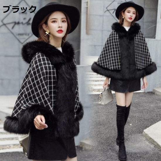 フェイクファーポンチョ レディース 羽織 アウター ポンチョ ケープ マント チェック柄 ふわふわ エレガント きれいめ フード付き 格子柄 ショート丈 クロップド丈 おしゃれ ブルー ブラック