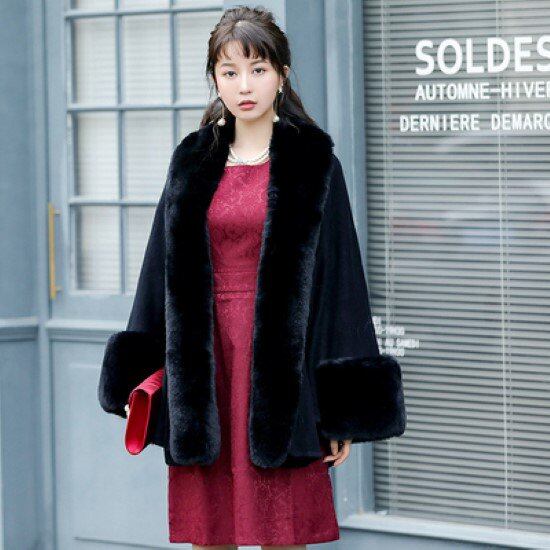 ふわふわのファーが大きなインパクトを与えるレディースケープコート。