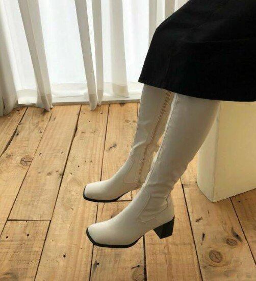 ロングブーツ レディース ブーツ 靴 シューズ ロング丈 スクエアトゥ 太ヒール カジュアル お出掛け シンプル 無地 サイドジッパー ファッションブーツ 美脚 脚長 大きいサイズ ロングブーツ