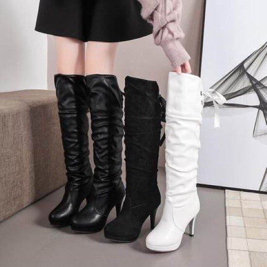 ロングブーツ レディース ブーツ 靴 シューズ ロング丈 シンプル 無地 ブラック ホワイト 黒 白 ハイヒール 美脚 スティレットヒール 脚長 レースアップ リボン 脚長 きれいめ カジュアル 女性