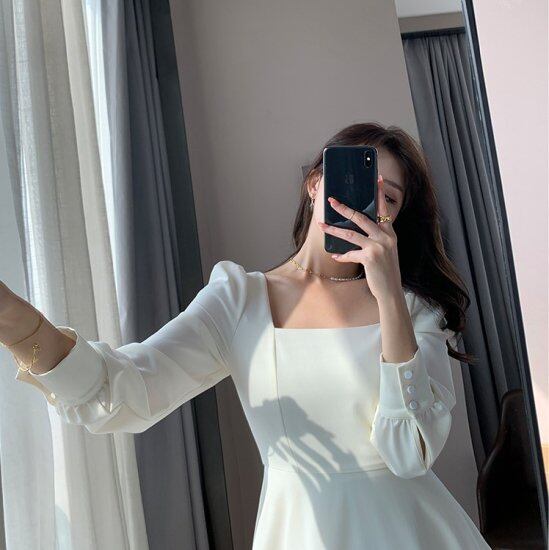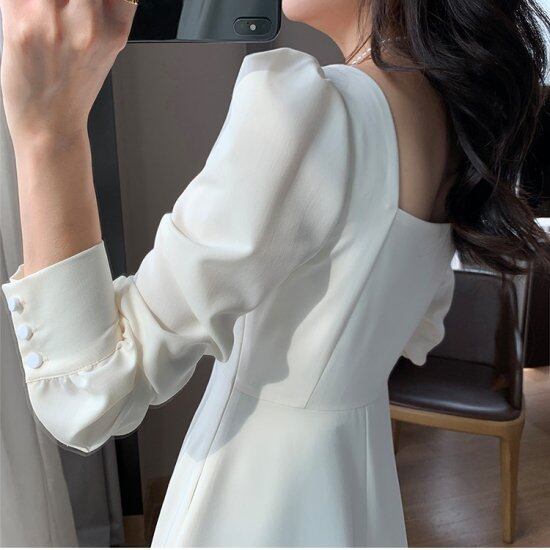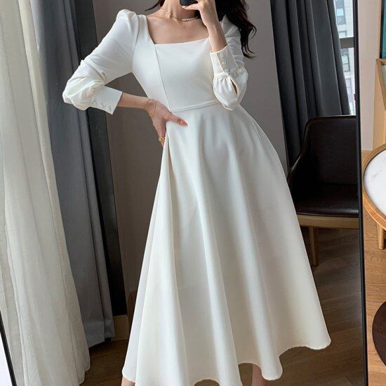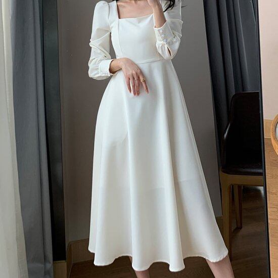 ロングワンピース マキシ丈 ミディアム レディース ロング丈 パフスリーブ 長袖 ロングワンピース スクエアネック 上品 エレガント ボタン 無地 シンプル マキシ丈 ワンピース スクエアネック