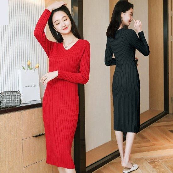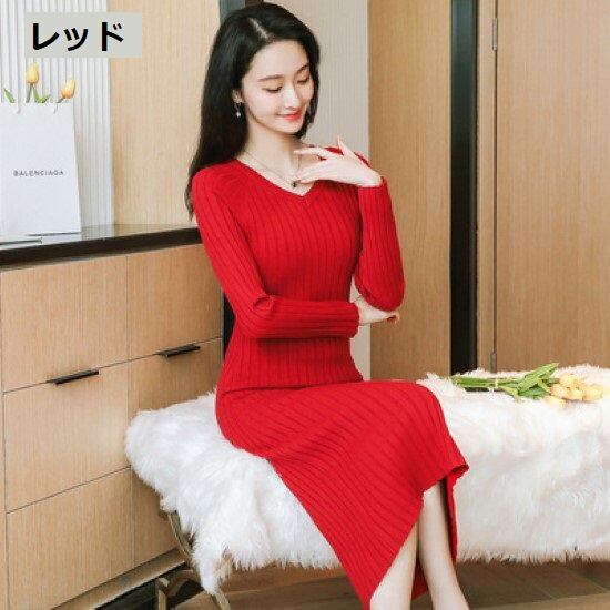 ニットワンピース レディース ワンピース ニット ひざ丈ワンピース Vネック 長袖 シンプル 無地 リブニット 秋冬 プルオーバー スリムフィット カジュアル お出掛け おしゃれ きれいめ ワンピース