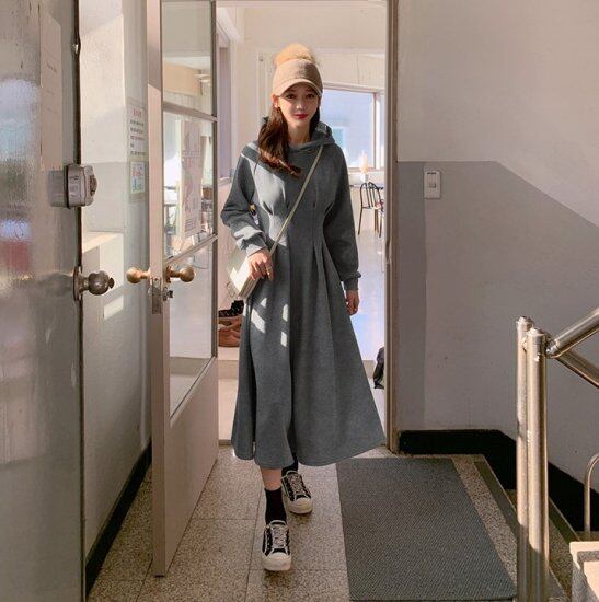 ロングワンピース フード付き Aライン ウエストタック ハイウエスト フーディ ミディアム丈 ロング丈 ワンピース ウエストマーク レトロ 体型カバー スリムタック かわいい ガーリー おしゃれ