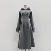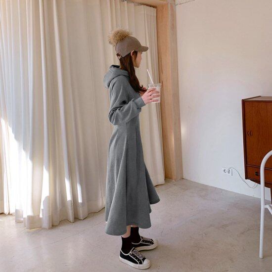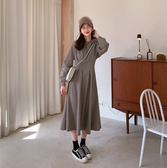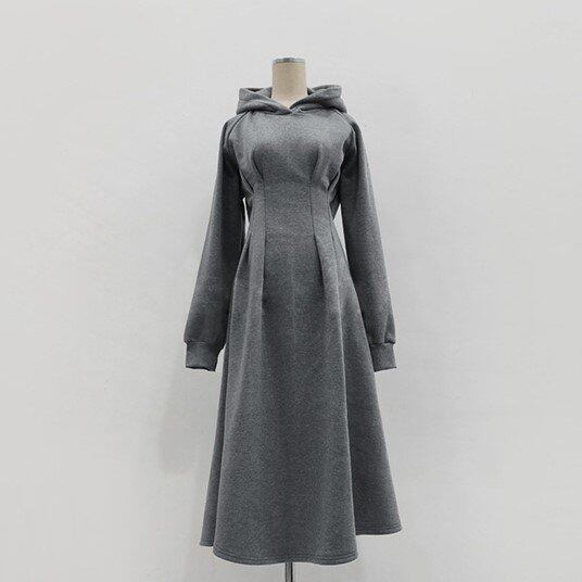 ウエストタックでメリハリのあるシルエットを作るフード付きワンピース。
