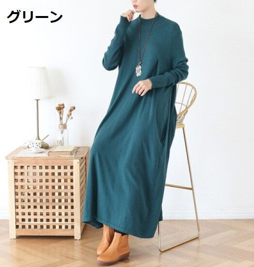 ロングワンピース レディース ワンピース 長袖 シンプル 無地 ゆったり 体型カバー ハイネック プルオーバー ルーズシルエット カジュアル お出掛け ニットワンピース ロング丈 女性 ワンピース