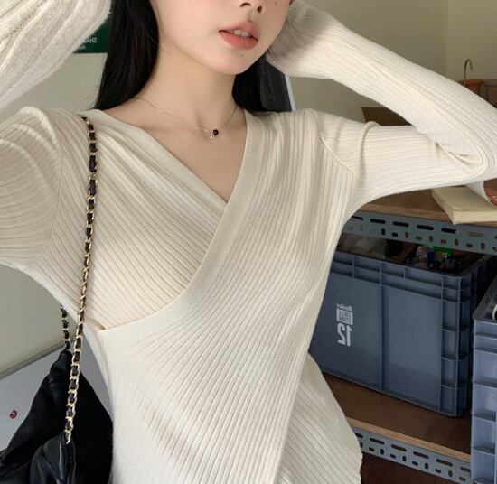 ニットトップス レディース トップス ニット セーター Vネック 長袖 クロスデザイン カジュアル お出掛け おしゃれ アプリコット ブラック プルオーバー スリムフィット リブニット トップス