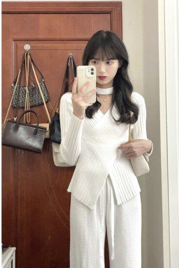 ニットトップス レディース ニット セーター トップス クロスデザイン Vネック ホルターネック 長袖 カジュアル お出掛け おしゃれ きれいめ スリムフィット 白 ホワイト ニットトップス 女性
