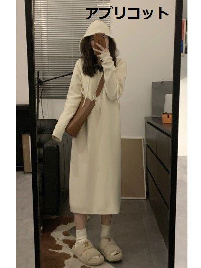 ニットワンピース レディース ロングワンピース ニット ワンピース ロング丈 フード付き シンプル 無地 長袖 秋冬 カジュアル お出掛け ゆったり ルーズシルエット ルームウェア ベーシック 定番