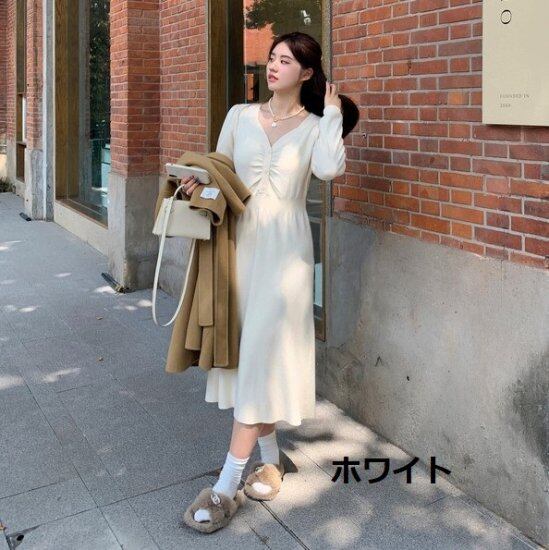 ニットワンピース Vネック 切り替えワンピース フロントボタン ロング丈 ミディアム丈 ウエストマーク ハイウエスト レディース シンプル ホワイト ブラック きれいめ エレガント おしゃれ 秋 冬