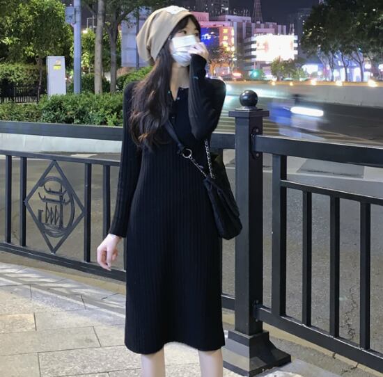 ニットワンピース レディース ワンピース ひざ丈ワンピース リブニット 長袖 シンプル 無地 定番 ベーシック カジュアル お出掛け ラウンドネック プルオーバー ボタン ブラック アプリコット