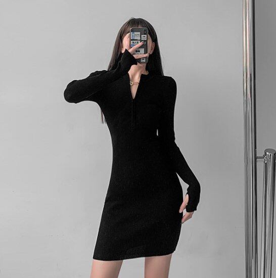 ハーフジップワンピース ニットワンピース ミニワンピース Vネック キーネック ハイネック ラウンドネック ショート丈 ミディアム丈 選べる丈 レトロ スリム タイトワンピース レディース 秋 冬