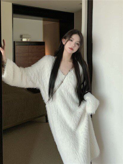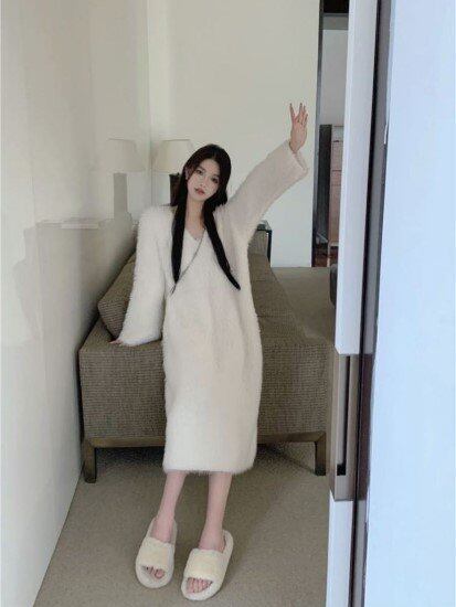 ニットワンピース レディース ロングワンピース ミドル丈ワンピース Vネック 長袖 シンプル 無地 ふわふわ モヘア ゆったり ルーズシルエット プルオーバー カジュアル お出掛け きれいめ 女性