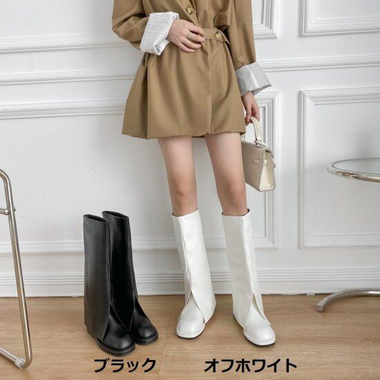 ロングブーツ スリット カッティング 個性的 ゆったり ルーズフィット 黒 ブラック 白 オフホワイト 4cmヒール レディース カバーブーツ ボリューム 折り返し レイヤード風 おしゃれ 秋 冬