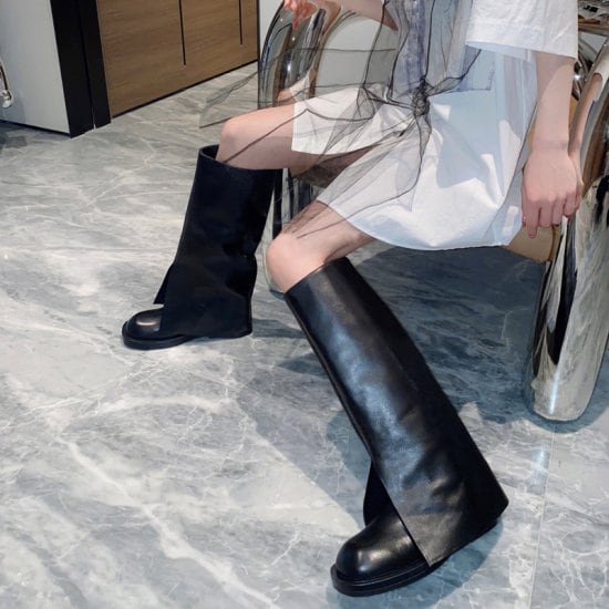個性的なデザインが目を惹くレイヤード風ロングブーツ。