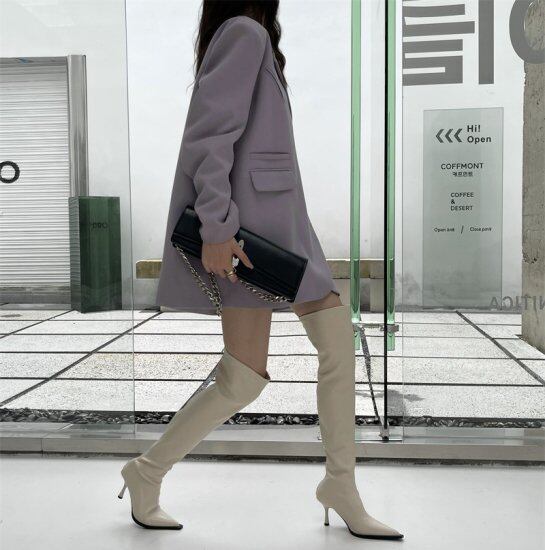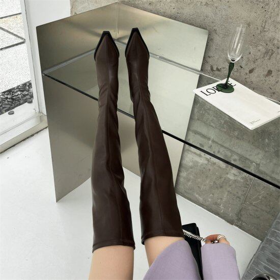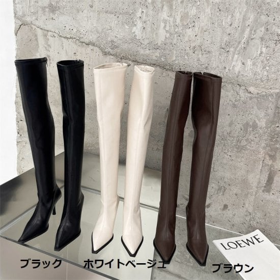 ロングブーツ ニーハイブーツ ハイヒール ストレッチブーツ ポインテッドトゥ フェイクレザー エコレザー ロング丈 スリムフィット レディース きれいめ エレガント おしゃれ 8cmヒール 秋 冬
