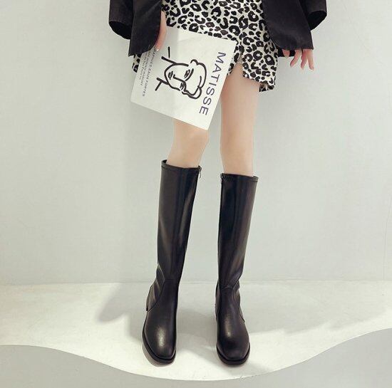 ロングブーツ スクエアトゥ サイドファスナー フェイクレザー エコレザー プレーントゥ 太ヒール 4cmヒール 黒 ブラック 白 ホワイト ブラウン レディース 美脚 大きいサイズ おしゃれ 秋 冬