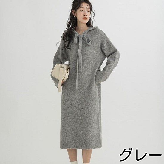 パーカーワンピース 大きいサイズ 冬 ニットワンピース ロングワンピース ロング リボン レディース ワンピース パーカー 秋冬 冬ワンピース リボンワンピース あったか 長袖 長袖ワンピース フード