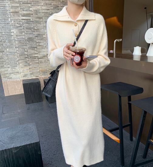 ニットワンピース レディース ロングワンピース ニットワンピ ロング丈 ワンピース 襟あり 長袖 ボタン シンプル 無地 プルオーバー ゆったり ルーズ カジュアル お出掛け 秋冬 ニットワンピース