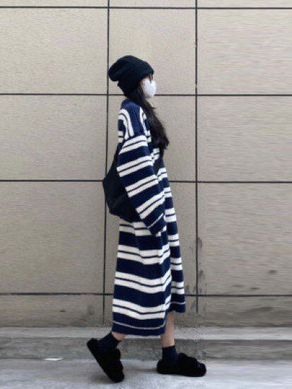 ニットワンピース レディース ワンピース ロングワンピース ニット ロング丈 ラウンドネック ボーダー カジュアル お出掛け ゆったり ルーズシルエット プルオーバー おしゃれ 長袖 ニットワンピ