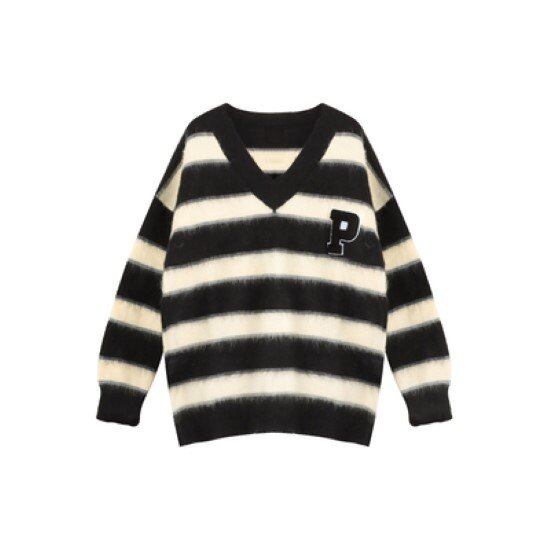 ニットセーター レディース ニットトップス セーター ニット トップス Vネック ボーダー 白黒 コントラストカラー 長袖 ゆったり ルーズシルエット プルオーバー カジュアル アルファベット