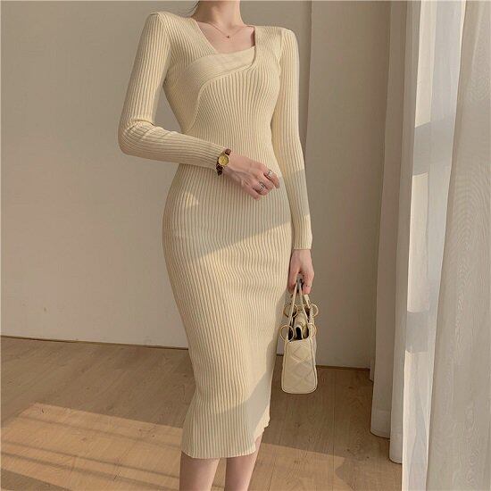 タイトワンピース 大きいサイズ 長袖 レディース 膝丈 ひざ丈 ニットワンピース ニット ワンピース 秋冬 秋 冬 新作 ひざ丈ワンピース お呼ばれ お呼ばれワンピース 長袖ワンピース Vネック