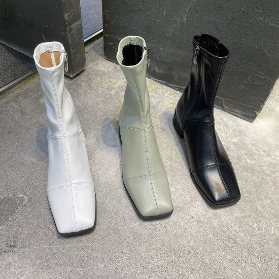 ショートブーツ スクエアトゥ サイドファスナー ローヒール ブロック パッチワーク 4cmヒール レディース フェイクレザー エコレザー ミドルブーツ ミディアム丈 おしゃれ 大きいサイズ 秋 冬