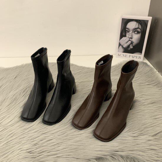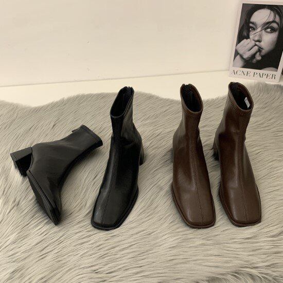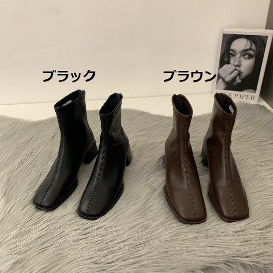 ショートブーツ レディース ブーツ 靴 シューズ 太ヒール チャンキーヒール 歩きやすい バックジッパー 履きやすい シンプル 無地 スクエアトゥ カジュアル お出掛け ブラック ブラウン 黒 茶