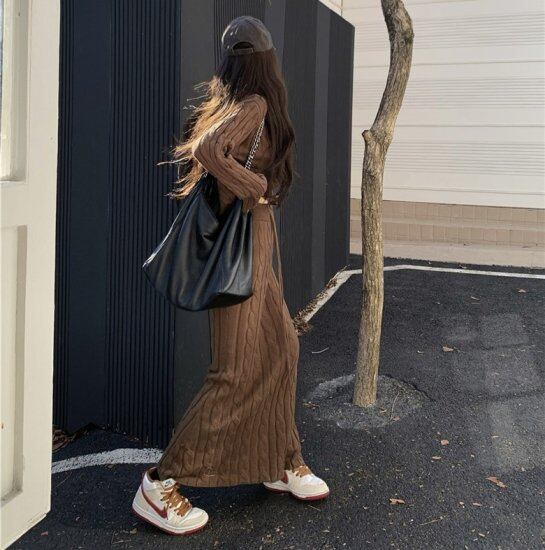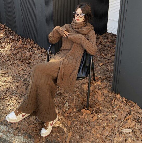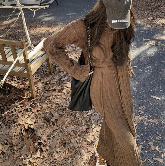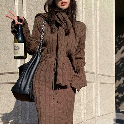 セットアップ ニットアップ 3点セット ニットトップス セーター プルオーバー ニットスカート ロング丈 マキシ丈 ロングマフラー ショール マフラー ケーブル編み おしゃれ カジュアル 秋 冬