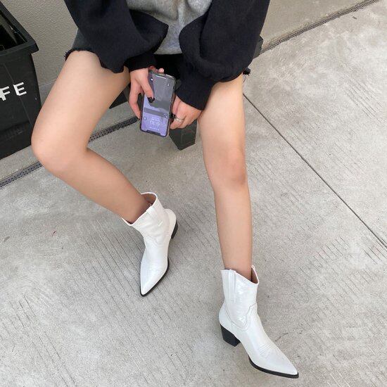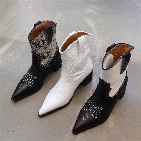 ショートブーツ ウェスタンブーツ バイカラー ポインテッドトゥ パイソン柄 フェイクレザー エコレザー 個性的 黒 ブラック 白 ホワイト 4cmヒール レディース カジュアル おしゃれ 秋 冬