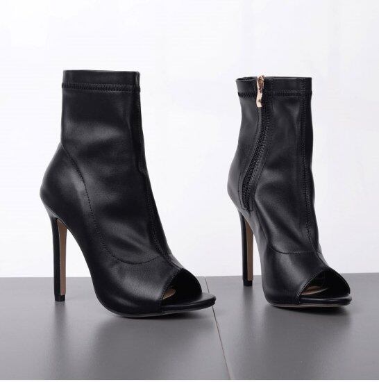 ショートブーツ オープントゥ ハイヒール サイドファスナー フェイクレザー エコレザー スリム ピンヒール 11.5cmヒール レディース アンクルブーツ セクシー おしゃれ 黒 ブラック 春 秋