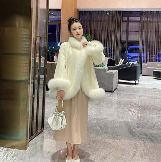 ハーフコート ファー付きコート ケープ マント フェイクファー エコファー レトロ クラシカル ホワイト ベージュ ピンク レディース かわいい きれいめ エレガント おしゃれ パーティー 秋 冬