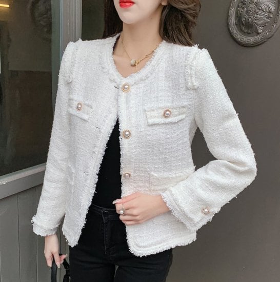 ツイードジャケット ラウンドネック ショート丈ジャケット ツイード フリンジ パールボタン レディース 白 ホワイト ピンク きれいめ 華やか 上品 パーティー オケージョン フォーマル おしゃれ