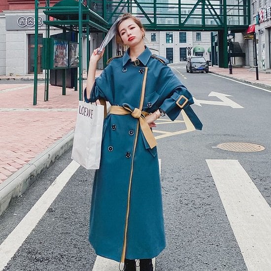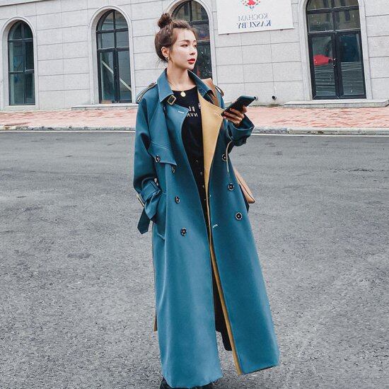 バイカラーの色使いが鮮やかなロングトレンチコートです。