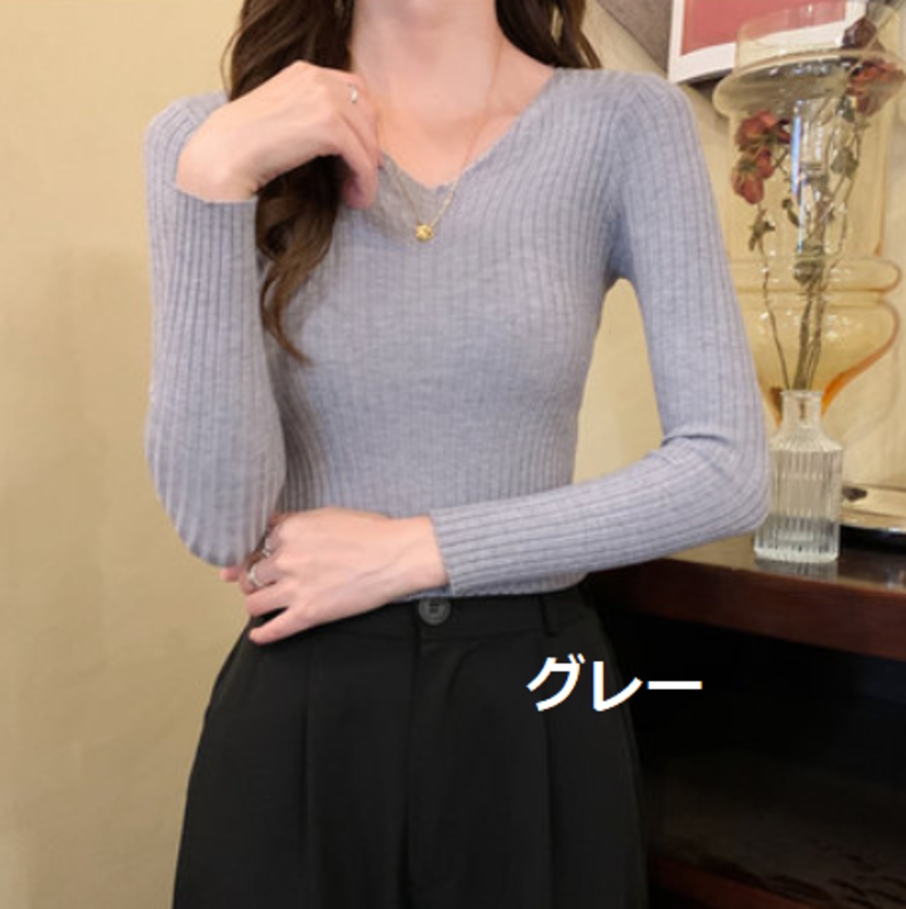 リブニットですっきり着られるVネックセーター。