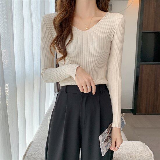 Vネックセーター リブニット トップス ニットセーター ニットトップス 長袖 プルオーバー レディース 黒 ブラック ホワイト スリム コンパクト カラーバリエーション 15colors おしゃれ