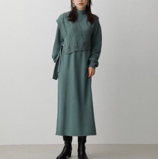 セットアップ ニットアップ ニットワンピース ベスト アシンメトリー ケーブル編み ニットベスト ロングワンピース レディース 緑 グリーン ツーピース きれいめ おしゃれ セットニット 秋 冬