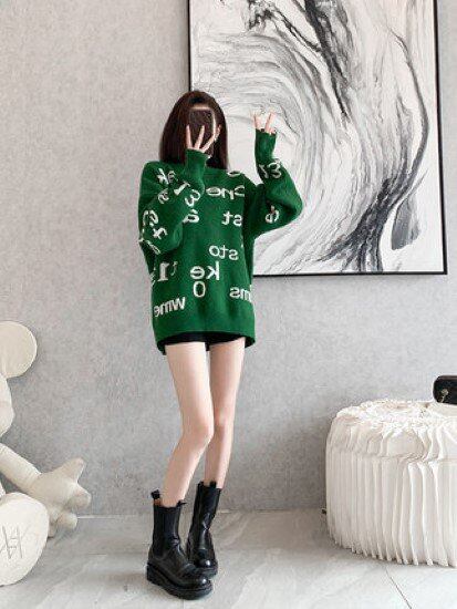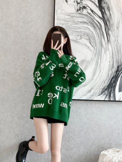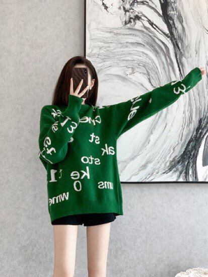 ニットトップス レディース ニットセーター トップス ニット セーター アルファベット柄 英字 長袖 プルオーバー ラウンドネック カジュアル お出かけ おしゃれ 緑 グリーン ゆったり ニット