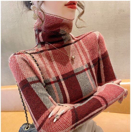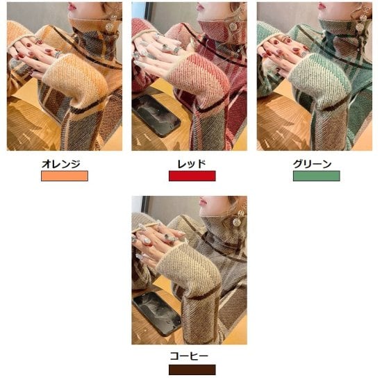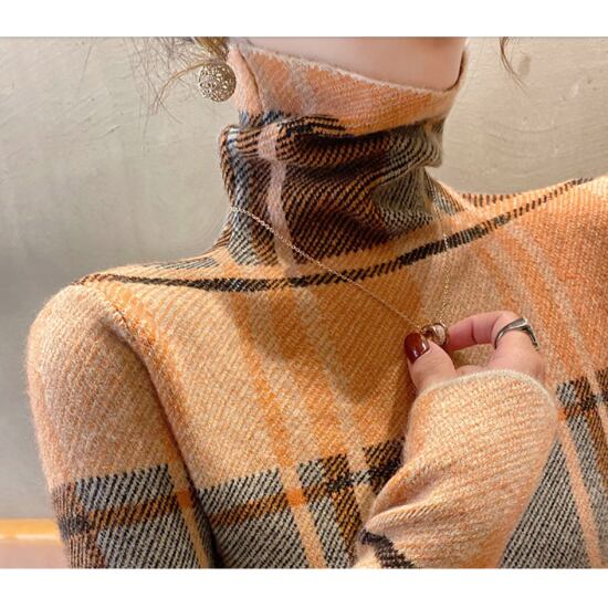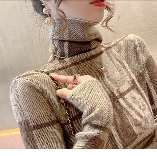 ニットトップス チェック柄 タートルネックセーター ニットプルオーバー セーター インナーニット ハイネック スリム フィット レディース ブラウン グリーン カジュアル 個性的 おしゃれ 秋冬