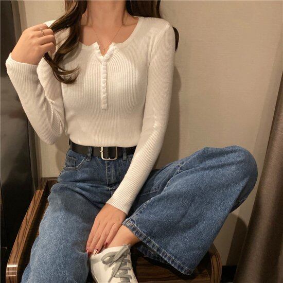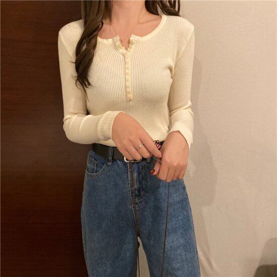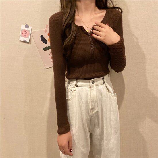 フロントの小さなボタンがアクセントのリブニットトップス。