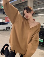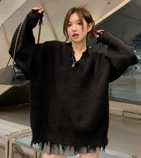 ニットトップス レディース ダメージ加工 ダメージニット セーター プルオーバー トップス Vネック ゆったり ルーズ カジュアル お出かけ おしゃれ 個性的 ブラック キャメル 無地 ダメージニット
