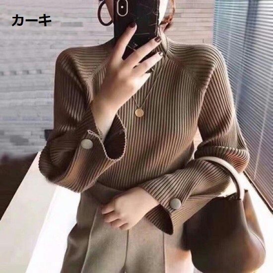 ニットセーター レディース ニット トップス セーター ハイネック リブニット 袖ボタン シンプル 無地 カジュアル お出かけ おしゃれ きれいめ 長袖 プルオーバー ゆったり ニットセーター ボタン