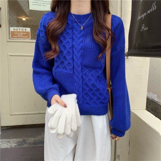 ニットセーター レディース ニットトップス セーター ニット トップス プルオーバー ラウンドネック 長袖 厚手 秋冬 ツイスト ケーブル編み おしゃれ カジュアル お出かけ 青 ブルー ニット
