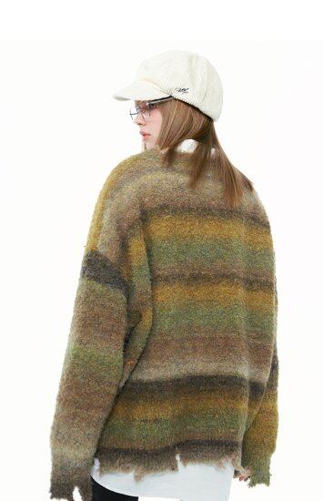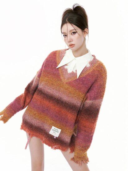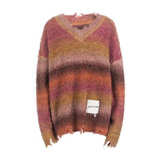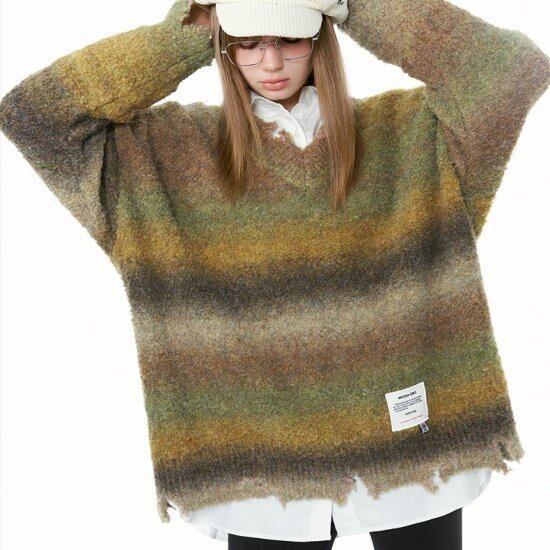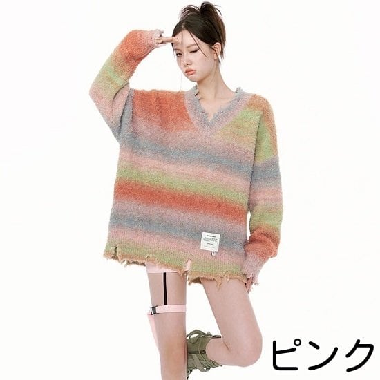 Vネックニット レディース 大きいサイズ 冬 秋冬 Vネック ニット ニットセーター 深Vネック トップス オーバーサイズ ボーダー グラデーション ダメージ クラッシュニット レディースニット