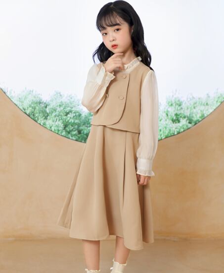 卒園式 子供服 ワンピース フェイクツーピース 重ね着風 長袖ワンピース ガールズ キッズ 女の子 入園式 入学式 卒業式 フォーマル お呼ばれ 発表会 フリルカラー ボタン 可愛い 膝丈ワンピース