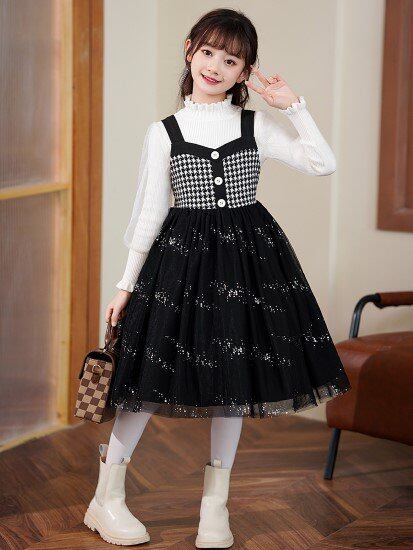 卒園式 子供服 ワンピース インナー 長袖 2点セット ツーピース 女の子 キッズ ガールズ ノースリーブワンピース チェック柄 スパンコール 可愛い リブニット カットソー フリルカラー 入園式