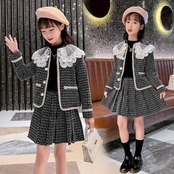 卒園式 子供服 ジャケット スカート セーター スリーピース 3点セット 入園式 入学式 卒業式 チェック柄 プリーツスカート 女の子 ガールズ キッズ レース襟 可愛い 長袖 おしゃれ お呼ばれ