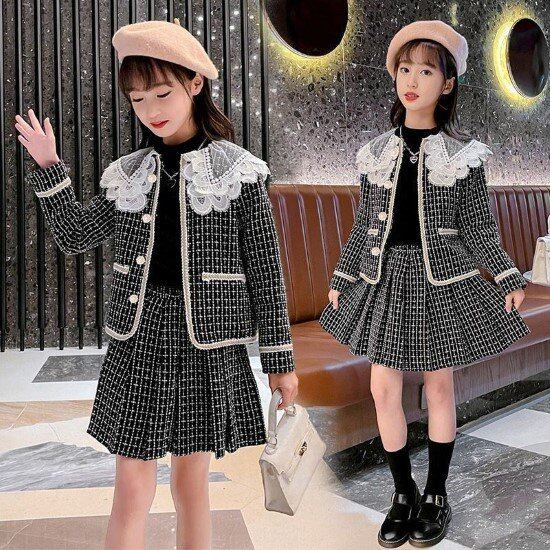 チェック柄のジャケット、プリーツスカート、インナーセーターの3点セット。