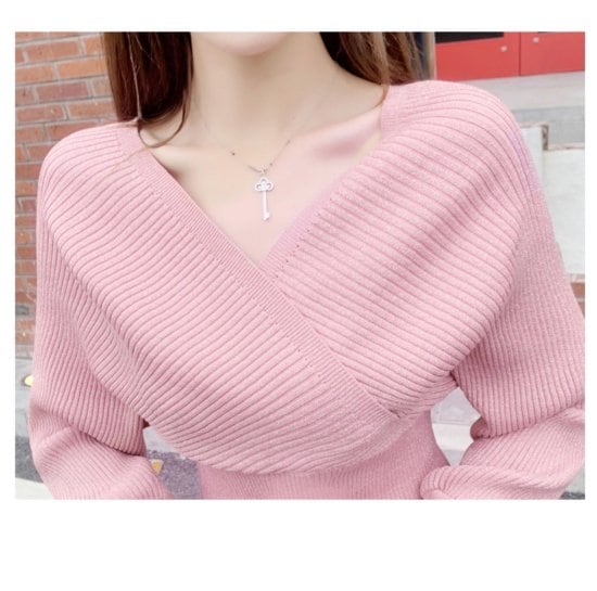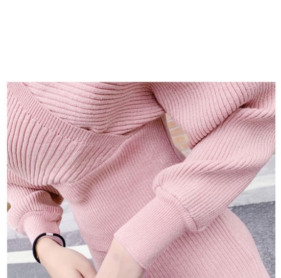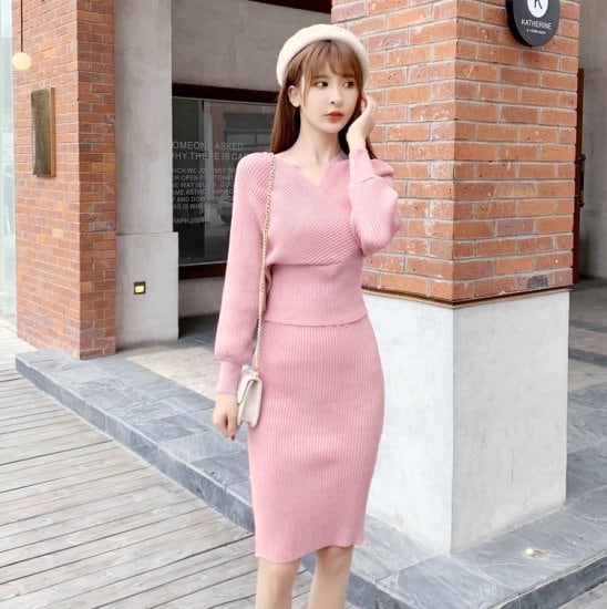カシュクールデザインが大人っぽいリブニットのセットアップ。