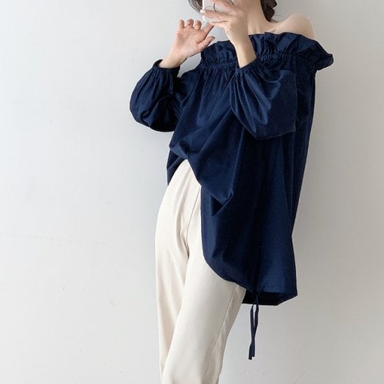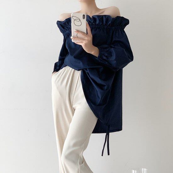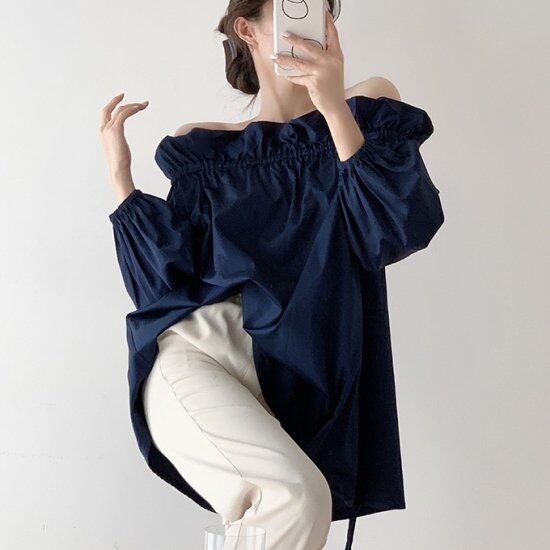 ブラウス オフショルダー ボリュームスリーブ フリル ギャザーブラウス コットンブラウス シャツ パフスリーブ ボリューム袖 裾絞り ワンショルダー 紺 ネイビー レディース おしゃれ 個性的 春夏